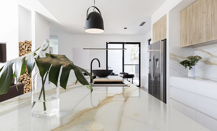 Con fondo blanco puro y vetas doradas, el porcelánico Marvel Gold de Techlam refleja la luz de los espacios y añade un toque de glamour a cualquier ambiente. La presencia del oro antiguo en sus vetas es sinónimo de nobleza: nos lo imaginamos como encimera de un mueble lacado en negro en un baño, con grifos en metal dorado mate. También es el revestimiento ideal para fachadas exteriores, que suma sus cualidades de resistencia, durabilidad y adaptabilidad a la espectacular belleza de su superficie. Marvel Gold es el material perfecto para suelos de alta gama, paredes interiores y exteriores y muebles: perfecto para rematar las islas de cocina más bellas o una espectacular mesa de comedor.